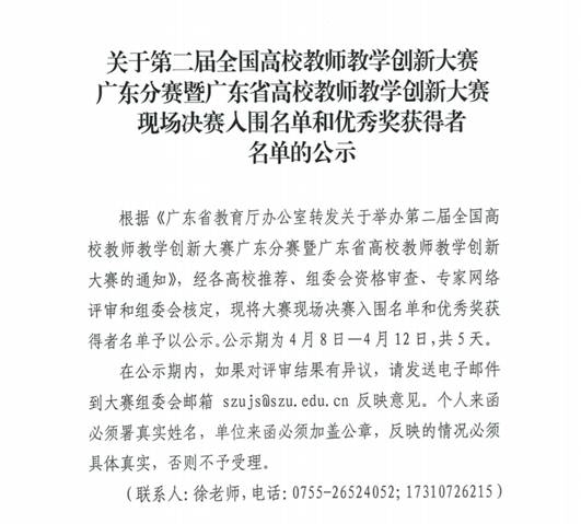 近日,第二届全国高校教师教学创新大赛广东分赛暨广东省高校教师教学创新大赛组委会办公室公示了第二届全国高校教师教学创新大赛广东分赛暨广东省高校教师教学创新大赛现场决赛入围名单,太阳成tyc9728集团夏一铭老师成功入围。