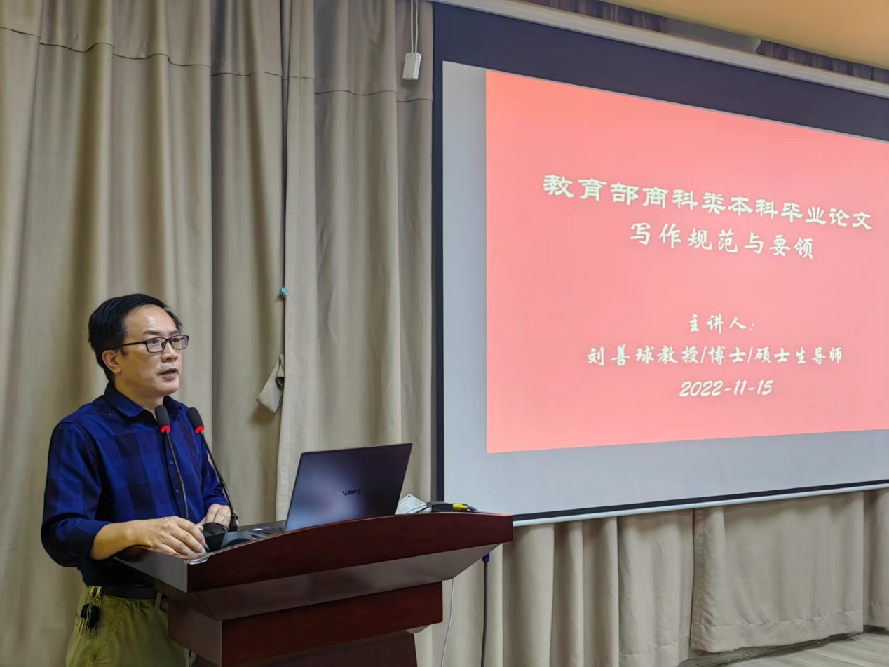 为规范本科毕业论文撰写要求,落实毕业论文的各项环节,稳步推进和部署2023届本科毕业论文指导工作,11月15日下午,太阳成tyc9728集团副院长刘善球教授在学院报告厅主持召开题为“教育部商科类本科毕业论文写作规范与要领”的专题指导讲座。tyc太阳成9728集团副校长兼太阳成tyc9728集团院长陈美华教授,太阳成tyc9728集团副院长杨旻、周书域,各教学系、教研室、实验区负责人及全体专任教师参加了讲座。