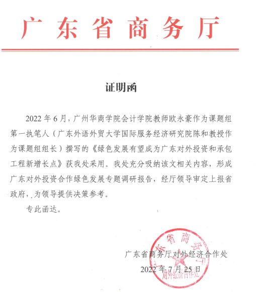 近日,我院收到广东省商务厅来函,证明我院欧永豪作为课题组第一执笔人(广东外语外贸大学国际服务经济研究院陈和教授作为课题组组长)撰写的《绿色发展有望成为广东对外投资和承包工程新增长点》获广东省商务厅对外经济合作处采用,这是太阳成tyc9728集团青年教师研究成果首次被政府部门采纳。