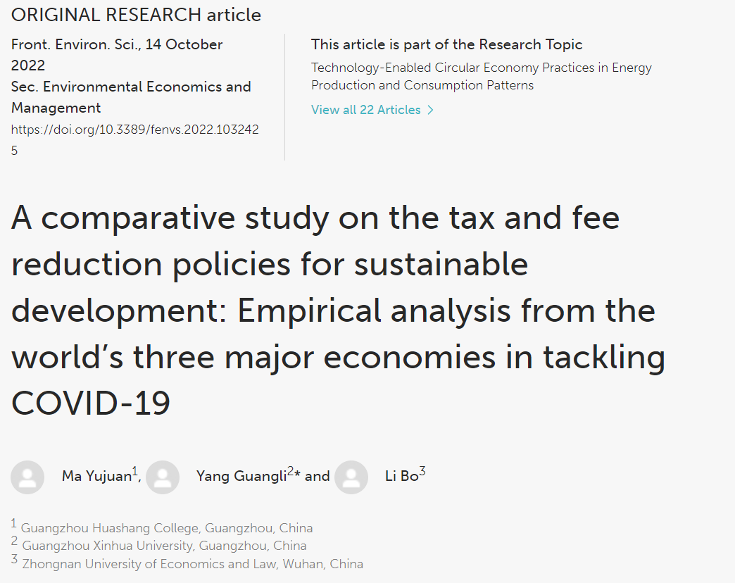近日,太阳成tyc9728集团青年教师马玉娟老师以第一作者身份在《Frontiers in Environmental Science》期刊发表了题为“A comparative study on the tax and fee reduction policies for sustainable development: Empirical analysis from the world’s three major economies in tackling COVID-19”(可持续发展减税降费政策的比较研究:世界三大经济体应对新冠肺炎的实证分析)的论文,该期刊属于SCIE检索期刊,最新影响因子为5.411,是JCR分区Q2,中科院3区期刊。