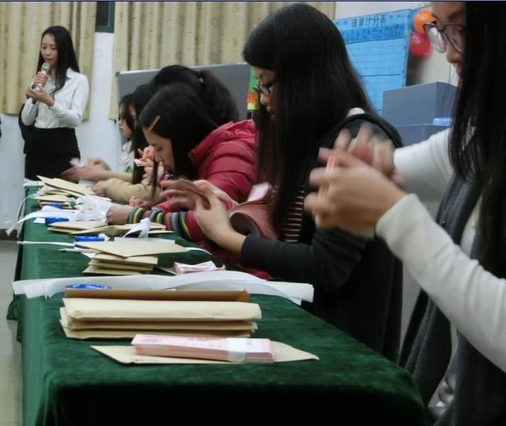 在主持人的宣布下,决赛拉开帷幕,首先播放的选手自我介绍视频为今晚比赛开了个好头。平安夜里,一场精彩激烈的比赛即将上演。通过一周的微信投票,各组选手用各自的魅力为自己拉得投票,而我们也将根据各组选手的投票排名进行加分。在工作人员安排下比赛正式开始,整场比赛分为三个环节:记账环节、点钞环节、珠算环节。首先进行的是记账环节,各组队员之间分工合作,紧张而有序地进行着登账。在记账环节开始之后,同时点钞环节也随即开始。各组所派队分别采用单指和多指手法进行两轮点钞,精彩纷呈的点钞手法引来观众的一片片惊叹,相信不单只是参赛选手,观众们也会从此次比赛中获益良多,在点钞环节中,主持人与观众的互动也让场上气氛变得更加活跃,比赛结果更加令人期待。