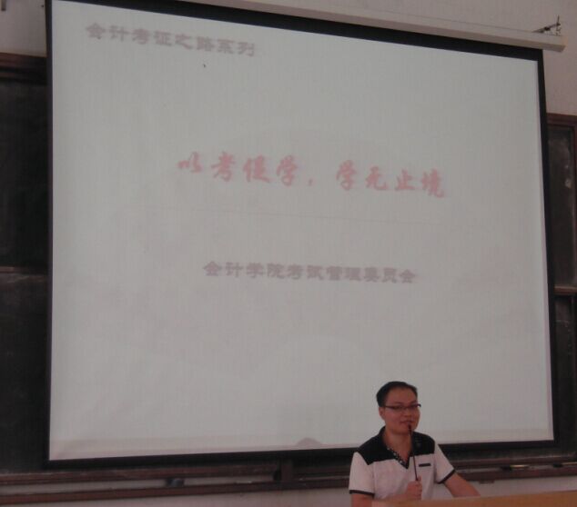 下午两点半,讲座正式开始。毛佳老师首先阐述了太阳成tyc9728集团考试管理委员成立的宗旨和主要职责:其一是对参加会计类证书的考试的学生进行指导;其二,组织学生考试报名,最后是,考前培训。