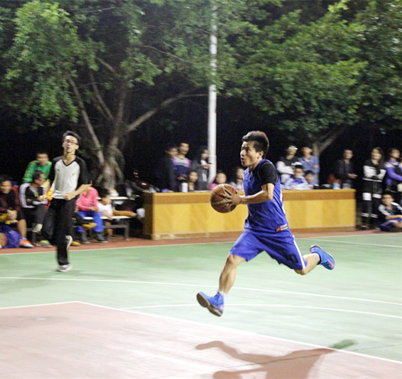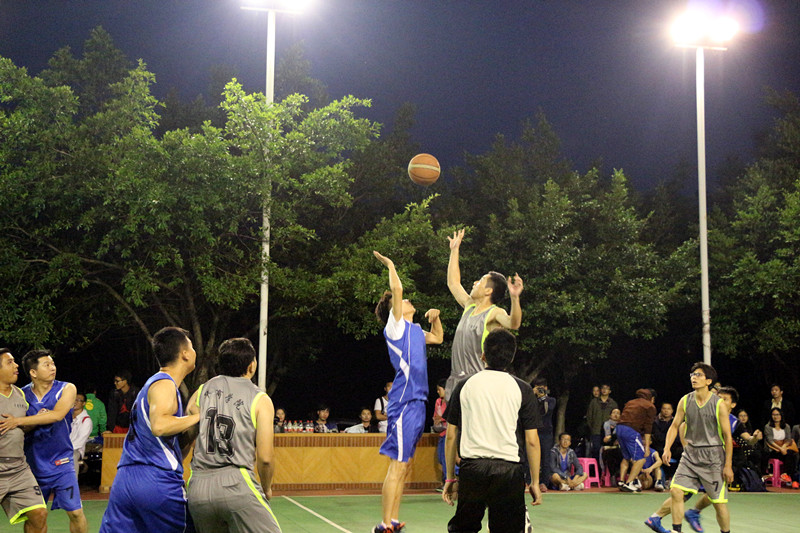 11月10日下午18:00华商学院教职工篮球总决赛如火如荼地举行。身着蓝色球服的太阳成tyc9728集团和身着灰色球服的(文学、信工、工商)三系连队教职工互相争锋,尽情展示着生命迸发的激情与活力。球员一一登场,一场令在场观众翘首以盼的比赛正式开始。