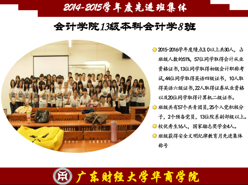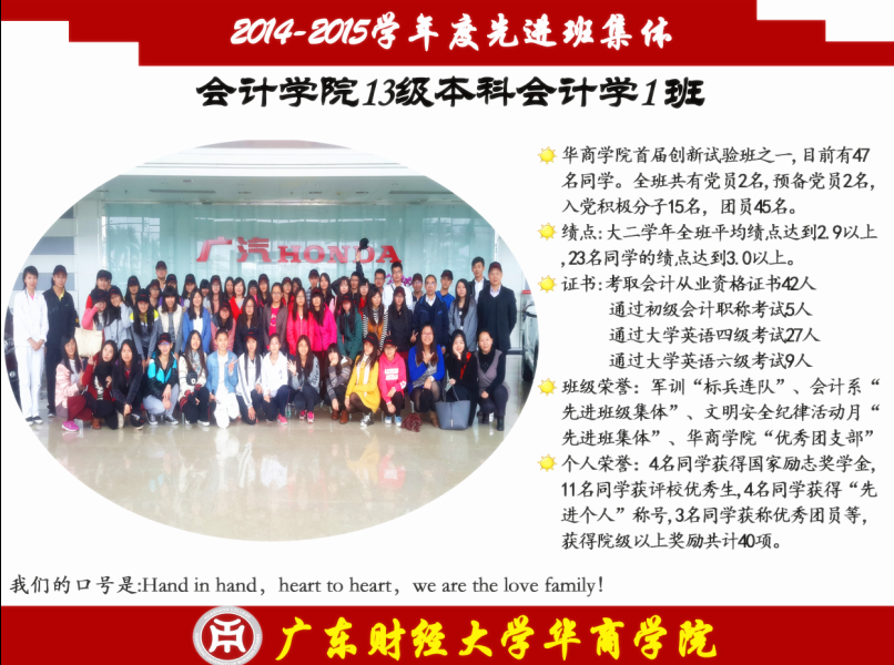 先进班集体是由一个有着不同个性的个体组成的,他们的展现方式各不相同,但他们有一个共同的特点——志存高远,他们是勇攀高峰的践行者,怀揣着征服科学高峰的梦想;他们是奋力扬帆的舵手,要在知识的海洋中自在遨游;他们是骏马,要在知识的草原上驰骋;他们是雄鹰,要在知识的天空中翱翔;他们是勇士,要在知识的历史中留下永不磨灭的印记。