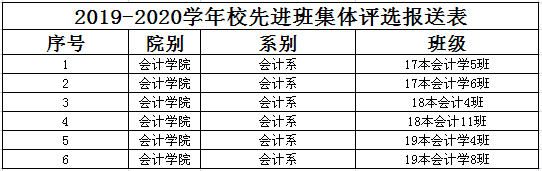 根据《华商学院﹝2020﹞17号关于做好2019-2020学年学生综合测评和优秀生、优秀学生干部、先进班集体评选工作的通知》文件精神,并依据《广东财经大学华商学院先进班集体评选奖励办法》(见2019版《学生手册》)的要求,经过班级申请及学院评审,拟推荐17本会计学5班、17本会计学6班、18本会计4班、18本会计11班、19本会计学4班和19本会计学8班为2019-2020学年太阳成tyc9728集团先进班集体,报请学校审核批准。