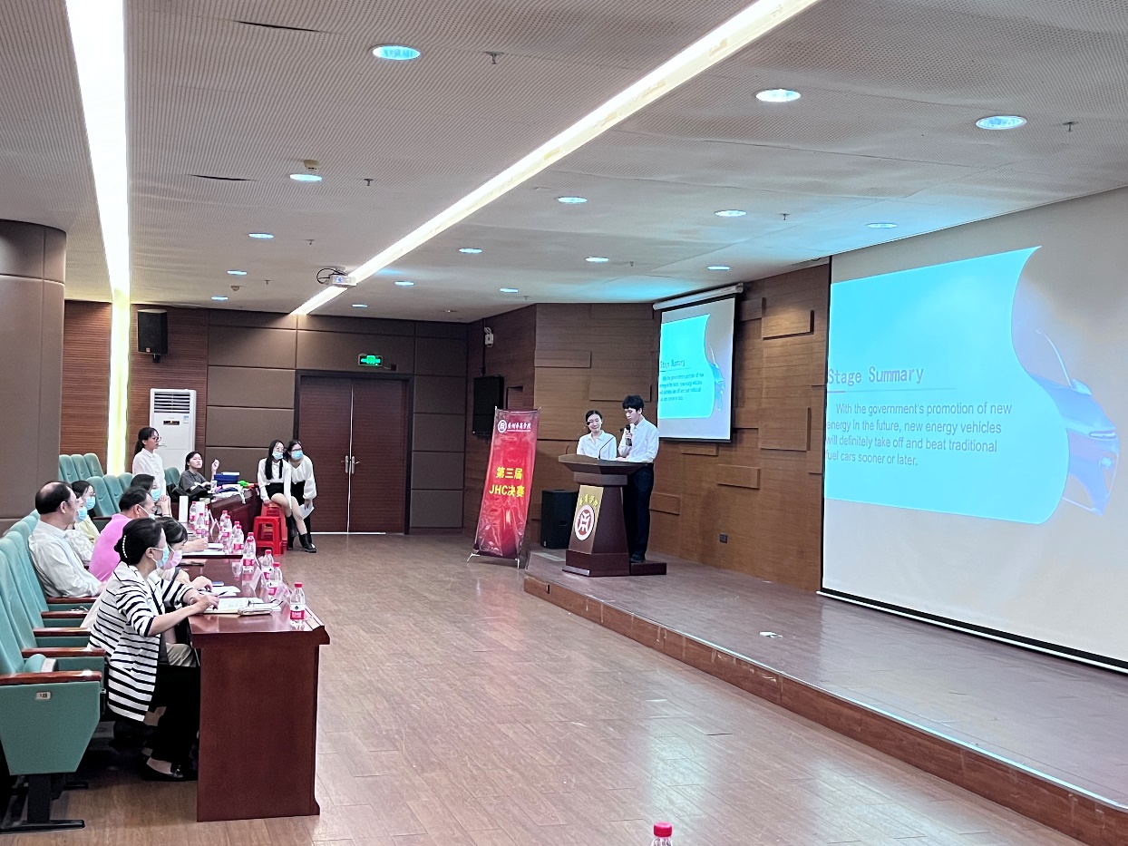 本次决赛的主要内容是:由通过复赛的五个小组分别按照给定的五个主题选取案例进行全英文的案例分析,五个主题和小组出场顺序为:第五队新能源汽车主题小组、第六队绿色环保主题小组、第一队新能源主题小组、第十二队高端制造主题小组、第二队生物医药主题小组。