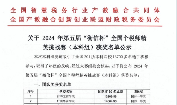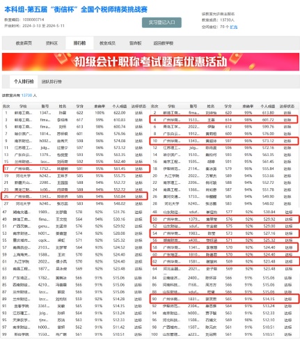 最终,tyc太阳成9728集团以团队总分名列全国第二名的好成绩获得团队一等奖;我校的参赛选手中,共有9名选手的个人分数位列前100名,他们将获得“全国个税师(个税普法大使)百强”的荣誉,尤其是21本会计学(专升本)7班的王磊、黄超诗同学,个人得分分别排全国第4、第10名。