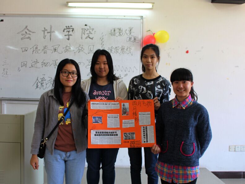 4月21日下午两点,读报剪纸初赛和摄影大赛复赛正式开始。参加读报剪纸初赛的参赛小组共有9组,3到8人一组,比赛时间为下午两点至四点,本次初赛将从九份作品中选出评分最高的三组进入决赛。各参赛小组在签到完毕后立即开始剪报作品制作,他们运用报纸、彩纸、彩笔等绘画和手工工具把自己的创意展现在画纸上,各小组成员分工合作,有条不紊的完成每一个步骤。在各小组成员的紧密合作之下,一份份精美的剪报呈现在我们的面前。与此同时举办的本次摄影大赛复赛将由10组作品中选出6组进入决赛,每份作品都配有精简的解说词,让每位投票的同学都能更好的明白每份作品的含义,在轻松愉悦的音乐中,同学们欣赏各参赛作品并为心仪的作品郑重的投出自己的一票。