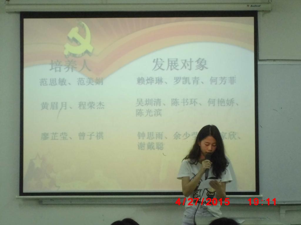 在会中,首先全体人员面向国旗奏唱国际歌。接着,14级王丽芬等9位预备党员和13级夏泳珺等20名重点发展对象先后在会上进行自我介绍,简单向党组织汇报自己的基本信息以及在思想、学习、工作、生活上的情况,同时面对入党介绍人对其提出的评价诚恳地接受并表示今后会再接再厉,不断完善自己。