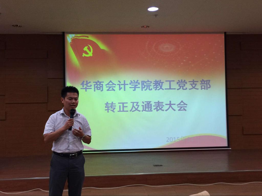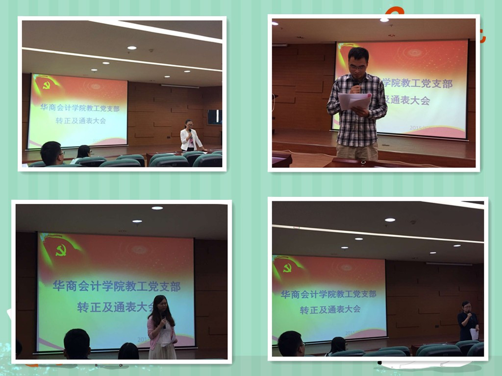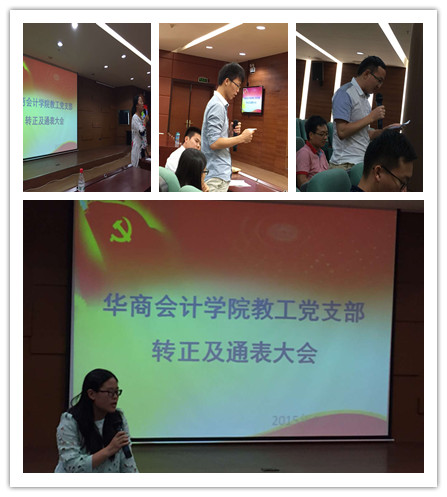 2015年11月17日17:00,华商太阳成tyc9728集团教工党支部2015-2016学年第一批通表大会及预备党员转正大会在图书馆一楼报告厅隆重举行,出席本次会议的有华商太阳成tyc9728集团党总支许娜副书记、教工党支部王敏书记和全体党员及4位发展对象。