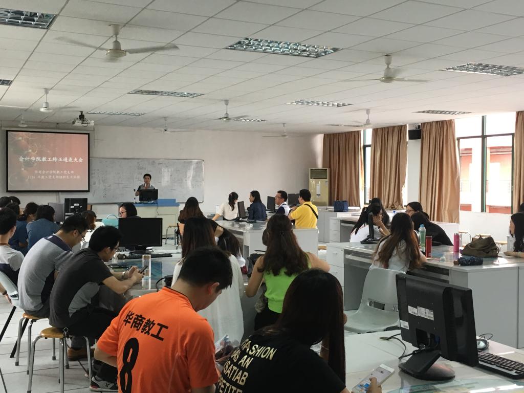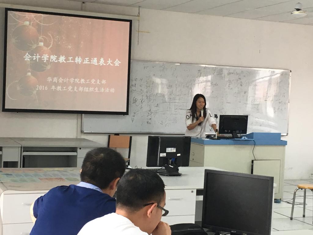 2016年4月26日下午,华商太阳成tyc9728集团教工党支部在厚德楼A507教室隆重举行了该年度预备党员转正及通表大会,出席本次大会的有华商太阳成tyc9728集团教工党支部书记王敏和全体教工党员。