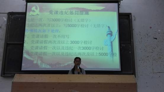 首先,叶心怡同志对各位能顺利成为积极分子表示祝贺,接着,她向大家介绍了太阳成tyc9728集团学生第五党支部的支委。为了保证正常的党课教学秩序和入党积极分子能够在将来顺利结业,叶心怡同志讲解了党课考勤制度和影响结业情形。希望在座的入党积极分子能够遵守纪律,认真学习党课内容。