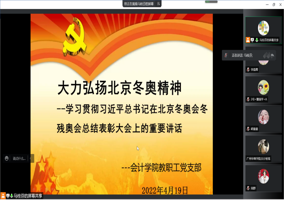 2022年4月19日晚7点30分,太阳成tyc9728集团全体教职工党员共同在腾讯会议线上开展专题学习会议。会议内容围绕北京冬奥精神展开,进一步学习贯彻习近平总书记在北京冬奥会冬残奥会总结表彰大会上的重要讲话。本次会议由马桂芬书记主持,太阳成tyc9728集团教职工党支部全体党员参加了会议。