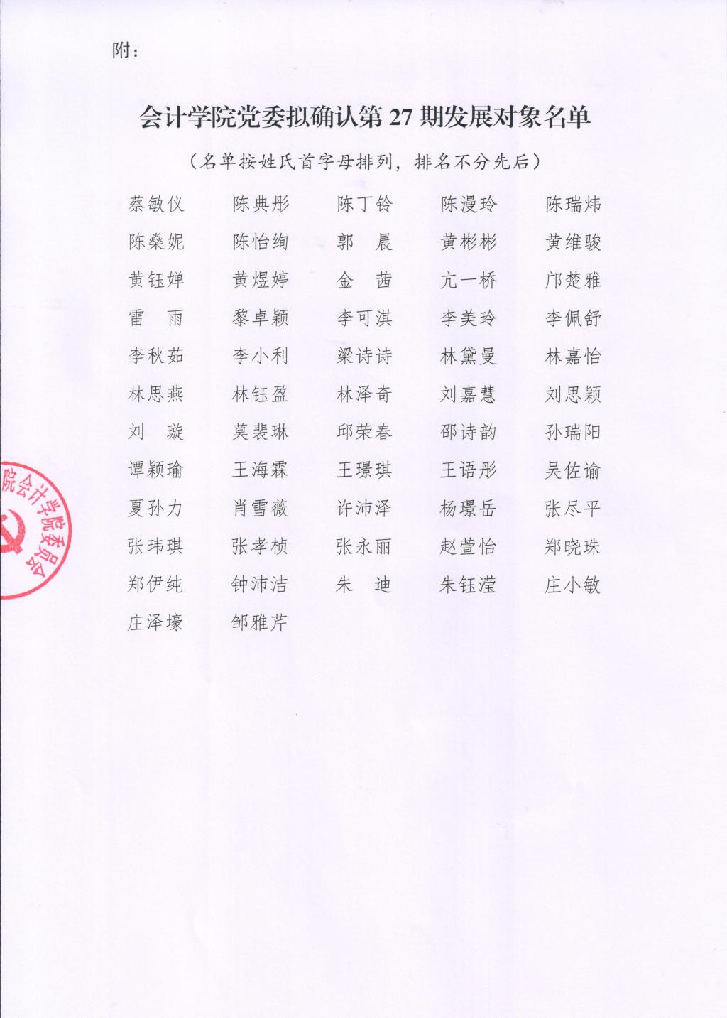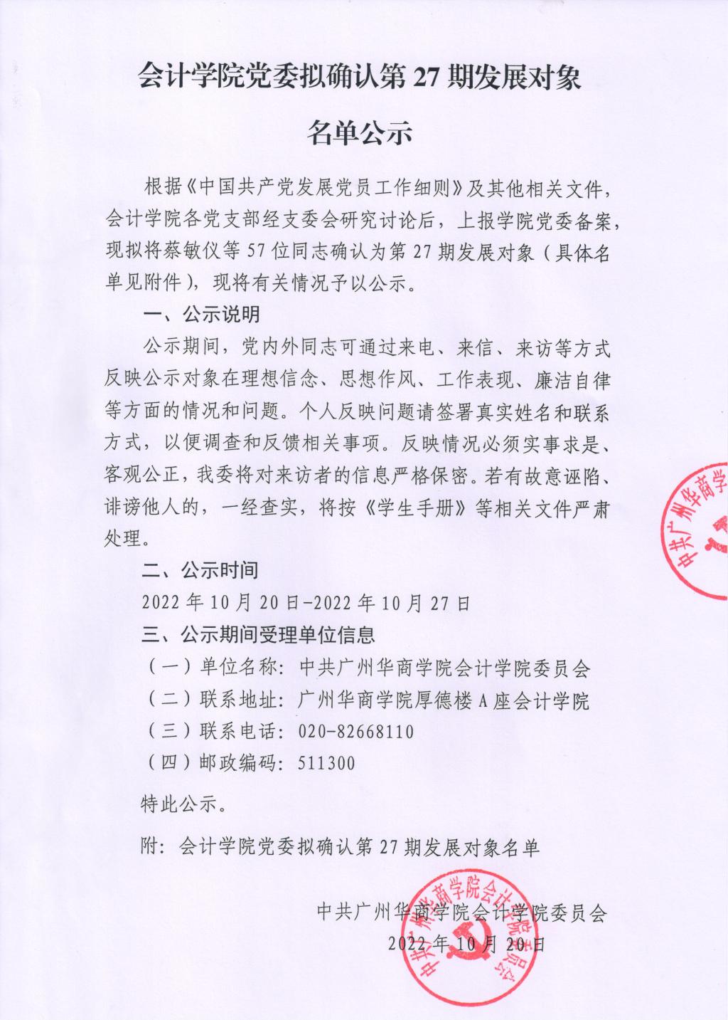 根据《中国共产党发展党员工作细则》及其他相关文件,太阳成tyc9728集团各党支部经支委会研究讨论后,上报学院党委备案,现拟将蔡敏仪等57位同志确认为第27期发展对象(具体名单见附件),现将有关情况予以公示。