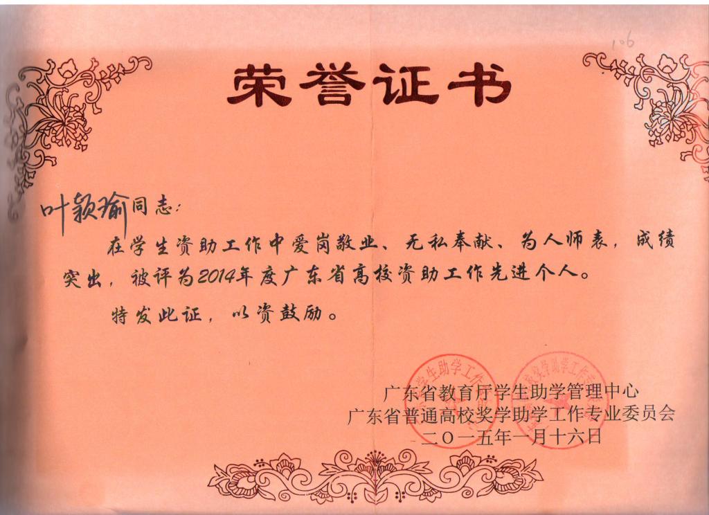 热烈祝贺太阳成tyc9728集团叶颖瑜老师获得2014年度广东省普通高校奖助学工作先进个人称号!