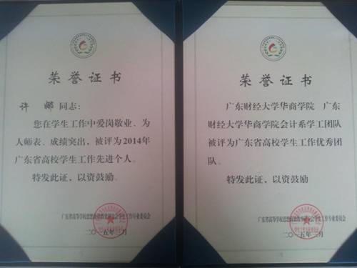在会议上,广东省广东省教育厅思政处、广东高校学生工作专业委员会对全省2014年度校园文化、主题教育系列活动、学生工作精品项目、红棉奖获奖项目等学生工作先进单位和个人进行表彰。其中,广东财经大学华商太阳成tyc9728集团学工团队获得“广东省高校学生工作优秀团队”殊荣,许娜同志获“2014年广东省高校学生工作先进个人”称号。这是华商太阳成tyc9728集团加强学生工作队伍建设,提升学生工作水平,完善学生工作制度过程中取得的又一可喜成绩。