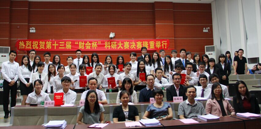 2015年5月13日18点30分,由广东财经大学太阳成tyc9728集团主办的第十三届“财会杯”科研大赛决赛在其北校区北3-103研究生学术报告厅隆重举行,我院的刘彩兰老师应邀担任本次大赛的评委之一。我院代表队伍Super Team队(队长:李东明,队员:邓锦兴、黄敏仪、黄慧娴)在广财大总决赛的舞台上力战四路群雄,表现优异,最终获得“三等奖”的好成绩,只是以微弱的差距落后于获二等奖广东金融学院。