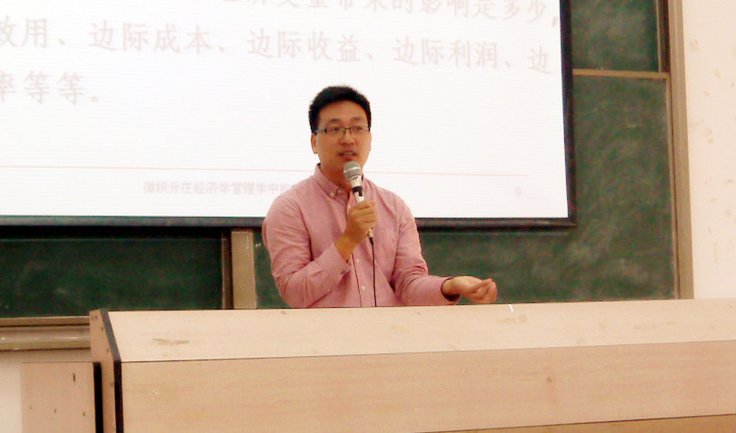 首先,由李远飞副教授作有关微积分在经济管理学中的应用的学术报告。讲座中,李远飞老师从微积分的概念、微积分要解决的问题、微分学在经济管理学中的应用、积分学在经济学中的应用四个方面系统地解析了本次讲座的主题,重点强调了有关微分学与积分学在经济管理学中的应用并通过生动形象的例子向同学们介绍了有关内容。最后他总结道“作为一个合格的企业经营者,应该掌握相应的数学分析方法,从而为科学经营决策提供可靠依据。”