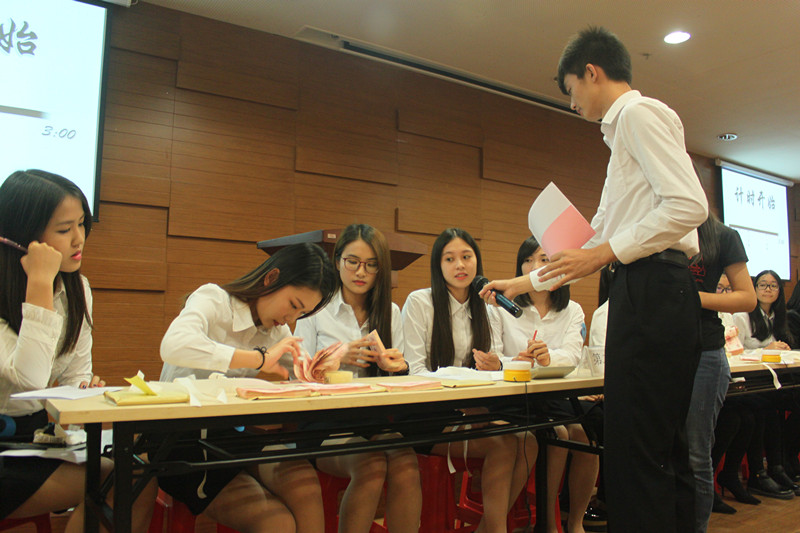 在播放参赛选手们的风采展示和亲友团助威后,比赛正式拉开帷幕。参赛队伍通过必答和抢答题的形式完成点钞、制作会计分录、案例分析等环节。点钞时那娴熟的手法、抢答时那快速反应能力、制作分录时那快速的运算、案例分析时那生动幽默的语言,让现场的观众们都称赞不已。各个小组的分数在各个环节不断地交替领先,比赛进行得紧张而激烈。