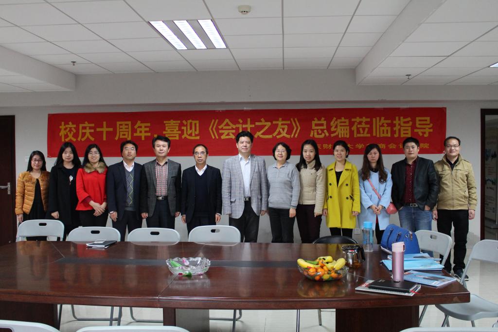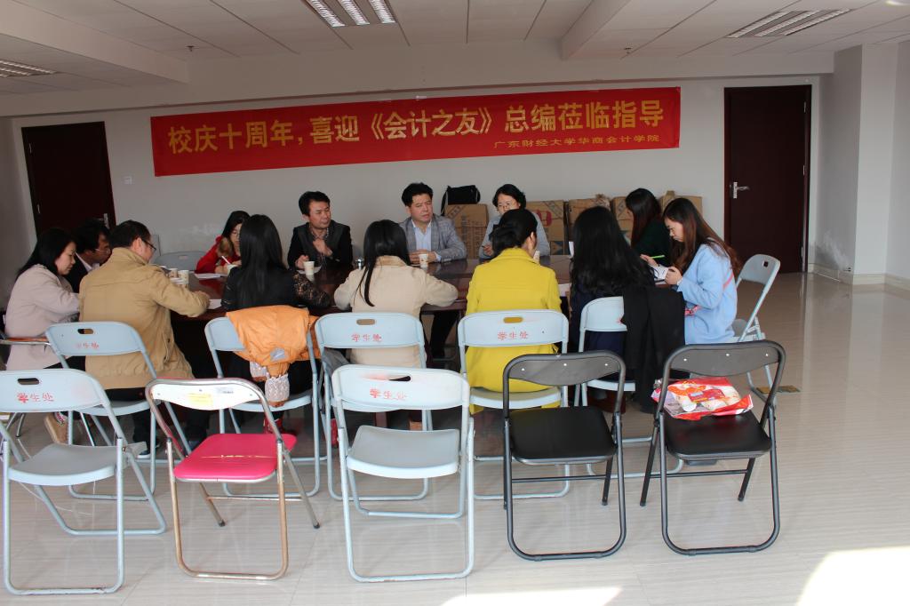 2015年12月25日,国家一级期刊《会计之友》杂志社笑雪主编应邀参加翌日举办的华商学院10周年校庆。当日下午,太阳成tyc9728集团特别邀请笑总编与太阳成tyc9728集团多位专业课教师在行政楼607会议室召开了一场主题为“论文写作规范和当前的财会热点参考选题”的学术交流会。太阳成tyc9728集团的领导、教研室正副主任及教师代表参加了交流会。