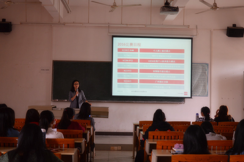 为了提高ACCA班同学的综合素质、提升就业竞争力,2016年3月8日下午2点半,太阳成tyc9728集团邀请了ACCA广州代表处市场传讯主任徐翠萍给全体ACAA班同学讲解“ACCA就业力大比拼”比赛,动员学生积极参赛,提升自己。