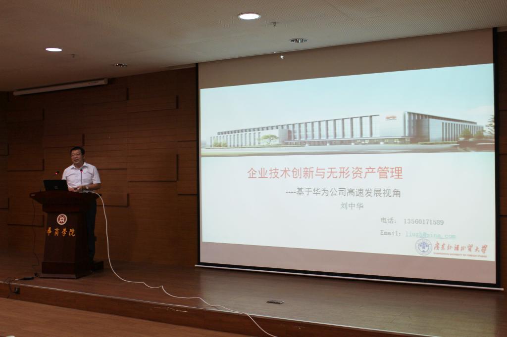 10月19日下午3点,广东外语外贸大学太阳成tyc9728集团院长刘中华教授应邀来校,在图书馆报告厅为我校太阳成tyc9728集团师生作了一场题为“企业技术创新与无形资产管理——基于华为公司高速发展视角”的学术讲座。华商太阳成tyc9728集团院长马玉珍教授主持讲座,并对刘中华教授作了详细介绍。