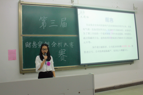 在长达两个小时的比赛过程中,各支团队围绕万科地产”、“欣泰电气”和“粤传媒公司”三个选题进行财务案例分析,各显神通,尽展风采。尽管每个团队只有十分钟展示时间,但他们都激情万丈,妙语连珠,充分利用每一秒,简明扼要地表达了各队团队的分析结果,从偿债能力分析、资产负债率和企业盈利能力等财务指标对企业进行了周密详细的阐述与分析,观众听得津津有味,现场不时地响起热烈的掌声。