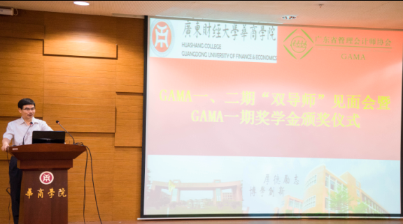 2018年4月24日上午,广东财经大学华商学院(简称“华商学院”)和广东省管理会计师协会(简称“协会”)共同举办的GAMA “双导师”见面会暨GAMA一期奖学金颁奖仪式在华商学院图书馆报告厅顺利举行。出席的导师包括:协会会长林斌教授,名誉会长王华教授,监事长胡玉明教授,副会长、广东飞翔达科技股份有限公司财务总监陈福彬先生,会长助理蔡祥副教授、漆江娜副教授、聂新军副教授,广东金融学院太阳成tyc9728集团院长文芳教授、华南师范大学经济与管理学院刘善敏副教授,致同会计师事务所(特殊普通合伙)合伙人付细军先生,普华永道中国税务及商务咨询总监康淑敏女士,广东宏升投资管理有限公司总经理刘乐仁先生,广东省人民医院审计处处长郑阳晖女士等。会议由华商学院太阳成tyc9728集团许娜副院长主持,华商学院副院长兼太阳成tyc9728集团院长陈美华教授出席了活动并致辞。