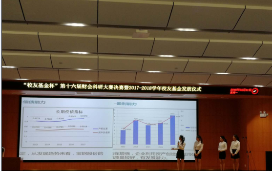 来自广东财经大学、广东金融学院、广东财经大学华商学院和中山大学南方学院四校共9支队伍参加决赛,决赛分为两个环节,论文展示和答辩环节。我院参赛队伍“慧越者”以“供给侧背景下宝武钢合并的动因及绩效分析”为题对他们的研究课题进行了精彩展示。面对评委老师的犀利提问,华商选手们旁征博引,机智应答,获得好评。经过两个多小时的激烈角逐,我院“慧越者”参赛队在大赛中表现突出,最终获得广东财经大学第十六届“财会杯”二等奖的好成绩。