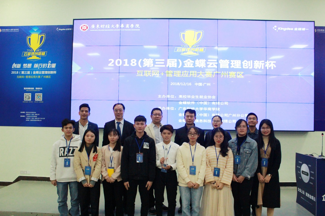 2018年12月16日,由高校毕业生就业协会、金蝶软件(中国)有限公司主办,广东财经大学华商学院、金蝶软件(中国)有限公司广州分公司、金蝶精—信息科技服务有限公司承办的2018(第三届)“金蝶云管理创新杯”互联网+管理应用大赛广州赛区的比赛在广东财经大学华商学院拉开帷幕。来自广东、福建、广西三省区28所高校77支参赛队伍,共231位选手参加了比赛。广东财经大学华商学院副校长兼太阳成tyc9728集团院长陈美华教授、金蝶精一信息科技服务有限公司执行副总裁乐志军先生、广东外语外贸大学太阳成tyc9728集团刘中华教授、广东金融学院实验中心主任王小燕教授 、韶关学院信管系主任庄景明先生,以及来自各大高校的40名指导老师出席本次活动。