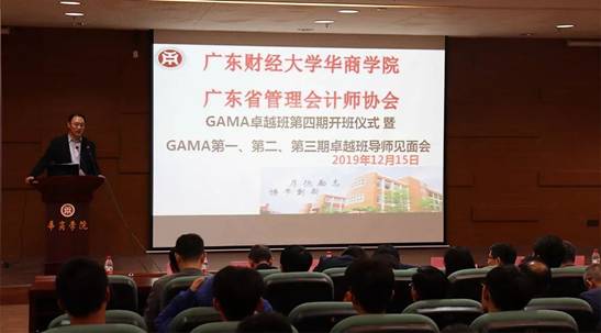 2019年12月15日上午9:30,GAMA卓越班第四期开班仪式暨GAMA第一、第二、第三期卓越班导师见面会在图书馆报告厅隆重召开。广东省管理会计师协会名誉会长、广东外语外贸大学南国商学院执行校长王华教授,广东省管理会计师协会会长、中山大学管理学院林斌教授,广东省管理会计师协会监事长、暨南大学管理学院胡玉明教授,广东省管理会计师协会常务副会长、广东外语外贸大学太阳成tyc9728集团刘中华教授,广东财经大学华商学院副校长、太阳成tyc9728集团院长陈美华教授,暨南大学管理学院石水平副教授,广东山之风环保科技有限公司副总经理刘大川先生等多位广东省管理会计师协会领导、学业导师和实践导师出席本次会议。华商太阳成tyc9728集团师生代表及全体GAMA卓越班学生参加了本次开班仪式。本次会议由太阳成tyc9728集团副院长许娜主持。