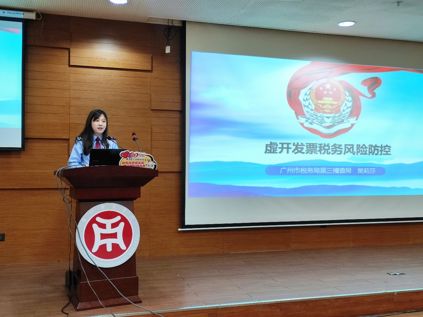 “同学们不论在未来是创业还是就业,都离不开和发票打交道。”樊莉莎同志强调,发票是企业抵扣税款、列支成本费用与员工日常报销的重要凭据,随着增值税发票全链条风险快速反应机制的不断完善,对发票违法犯罪行为的打击将会更快、更准、更高效。她向大家介绍了虚开发票的含义,结合现实具体案例分析虚开发票的风险和后果,并从提高风险防控意识、提升业务流程规范性、强化内部监督管理三方面提出税务风险防范的建议。