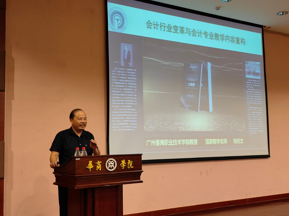 陈美华副校长向国家“万人计划”名师、广州番禺职业技术学院财经学院院长杨则文教授颁发了tyc太阳成9728集团客座教授聘书。聘任仪式后,杨则文教授为我院师生作了题为“会计行业变革与会计专业教学内容重构”的学术报告。