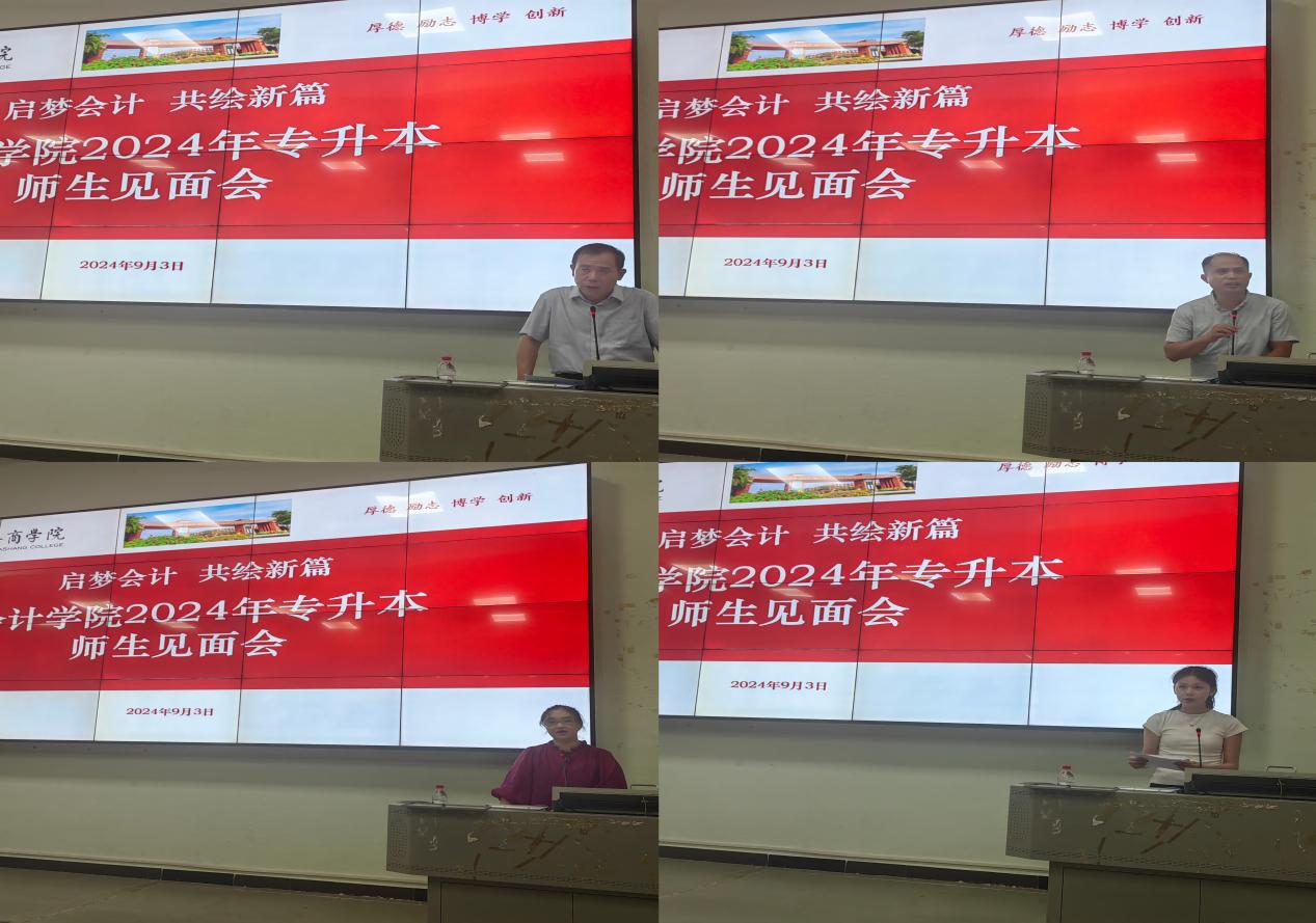 9月3日傍晚7点,太阳成tyc9728集团在励志楼B207隆重召开了一场主题为“启梦会计,共绘新篇”的2024年专升本师生见面会。太阳成tyc9728集团院长姚凤民教授,副院长刘善球教授、杨旻教授,副院长陈少鸿副教授,院长助理陈蒙梦副教授,22级年级副主任王丽军,辅导员王蓓、汤林以及2024年全体专升本新生参加本次见面会。
