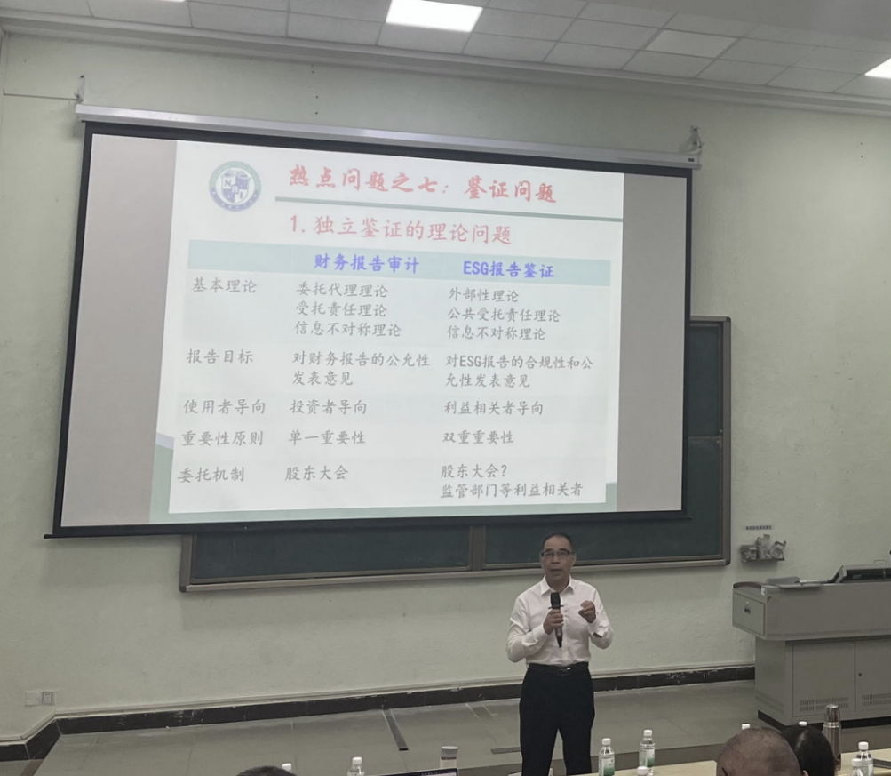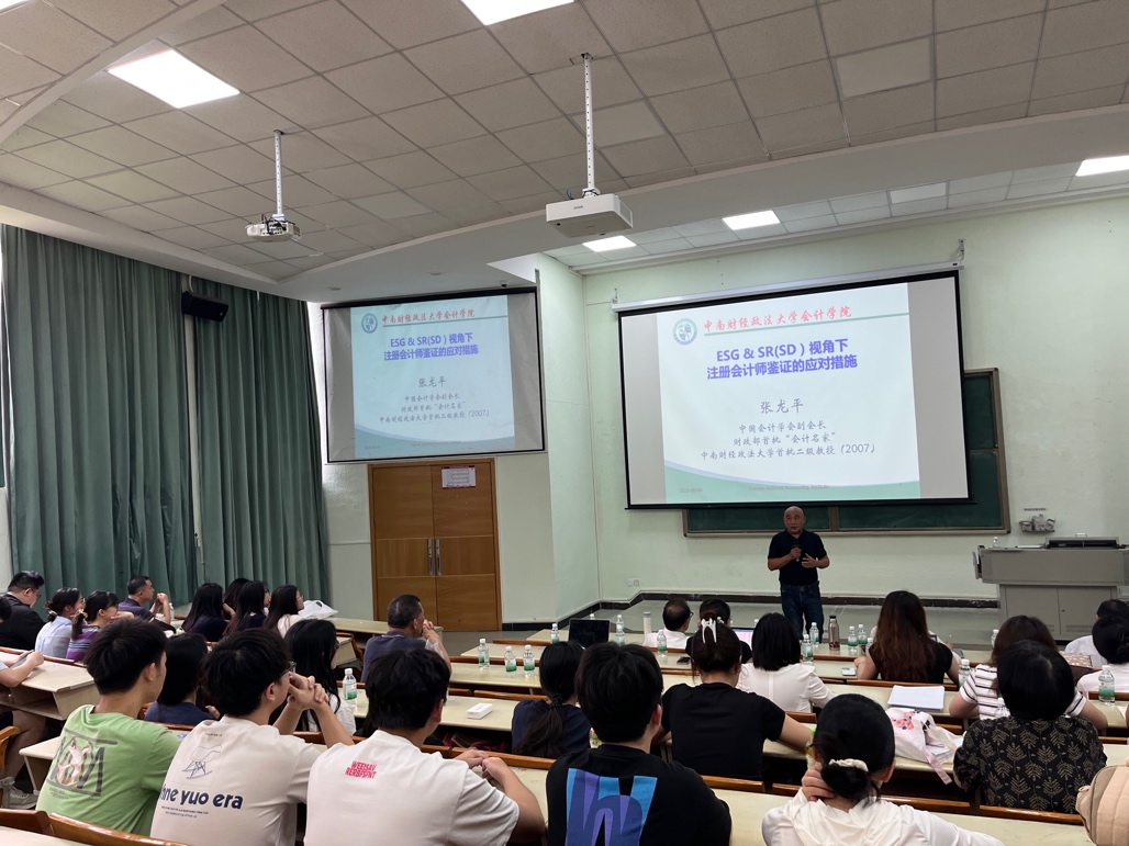 中南财经政法大学张龙平教授为太阳成tyc9728集团师生作题为《ESG&SR(SD)视角下注册会计师鉴证应对策略》的专题报告。张教授系统阐述了ESG/SR报告的背景、七大核心争议、全球统一准则的发展趋势以及这个趋势带来的“双重报告”革命。他重点分析了这对注册会计师行业产生的深远影响,特别是对独立鉴证业务带来的巨大机遇与严峻挑战,并提出了CPA行业积极应对的八项具体措施。他强调,这场变革要求财会审计监督和国家治理的目标、范围、思路和方法都必须进行根本性的重塑与变革。