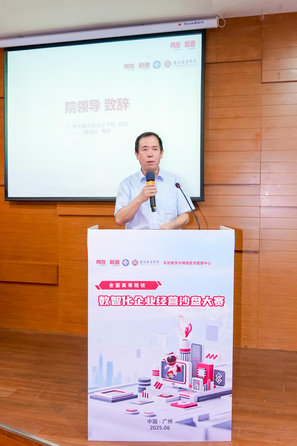 新道科技股份有限公司中南大区副总经理黄堪敬先生作为技术支持方发表致辞。黄副总详细阐述了数智企业经营管理沙盘平台的技术优势,并强调了其在确保赛事公平性和公正性方面所发挥的重要作用。