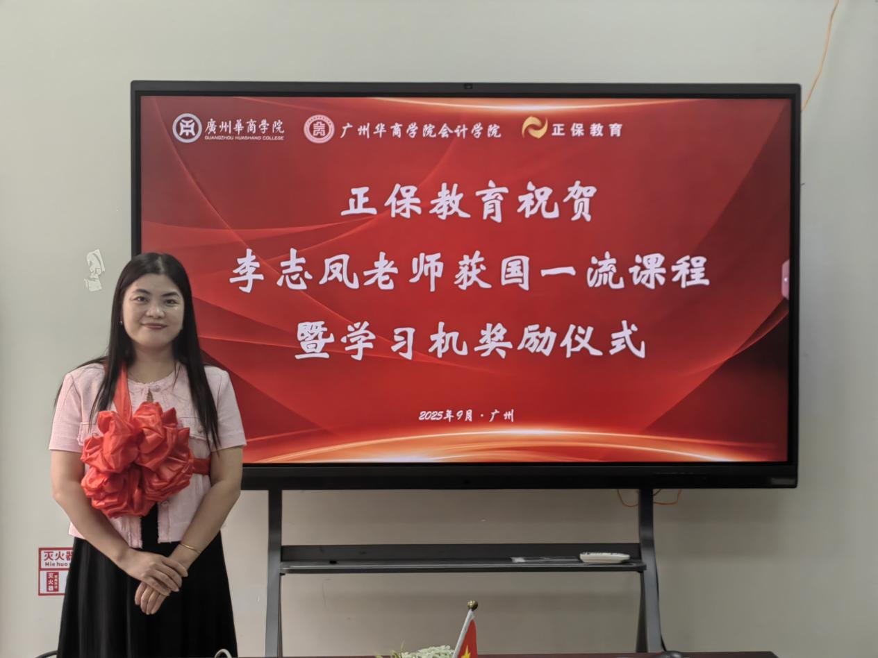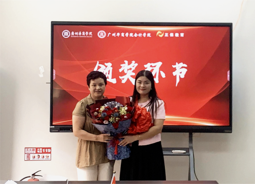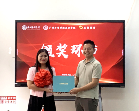 在热烈的掌声中,正保教育集团大区总监兼广东区总经理杨智浩先生、正保教育集团广州区域经理范雪娇女士上台,向李志凤老师赠送了精心准备的正保学习机设备。这不仅是一份礼物,更是对一线教师深耕教学、探索创新的崇高敬意,也体现了正保教育“科技赋能教育”的企业责任感与对高校事业发展的坚定支持。