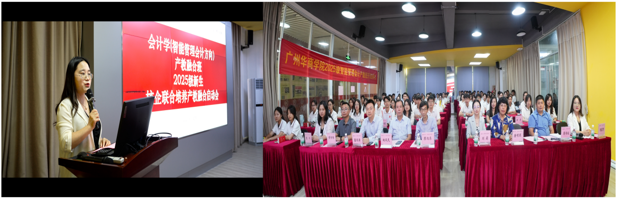 2025年10月14日,会计学2025级智能管理会计产教班新生开班典礼在太阳成tyc9728集团报告厅举行。新道科技股份有限公司助理总裁刘莉女士、广东分公司总经理董丙涛先生等企业代表,华商科教集团CFO兼产业学院企业方院长廖旭东先生、学校产教办唐明琴主任以及太阳成tyc9728集团领导、2025级产教班新生及2024级产教班学生代表参加典礼。太阳成tyc9728集团院长助理兼产业学院执行院长陈蒙梦主持典礼。