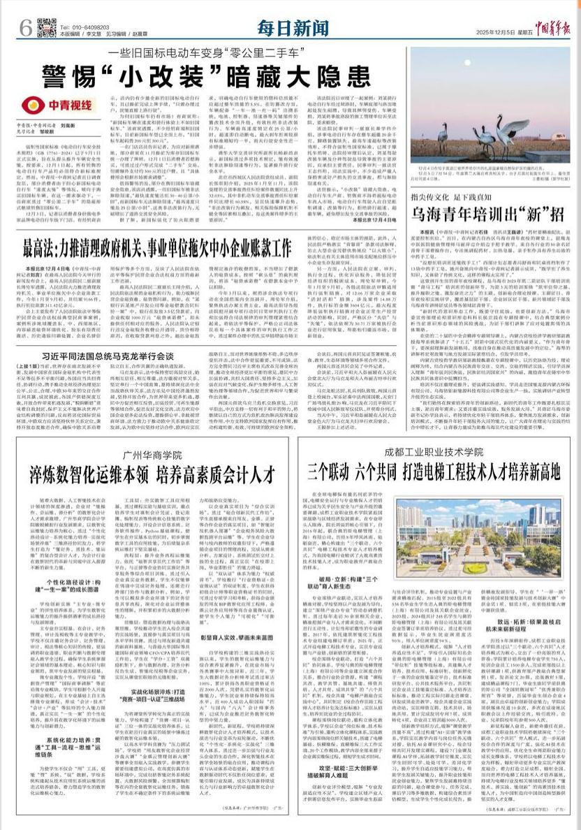 2025年12月5日,《中国青年报》第六版以“淬炼数智化运维本领 培养高素质会计人才”为题,报道了我校太阳成tyc9728集团的创新育人实践。