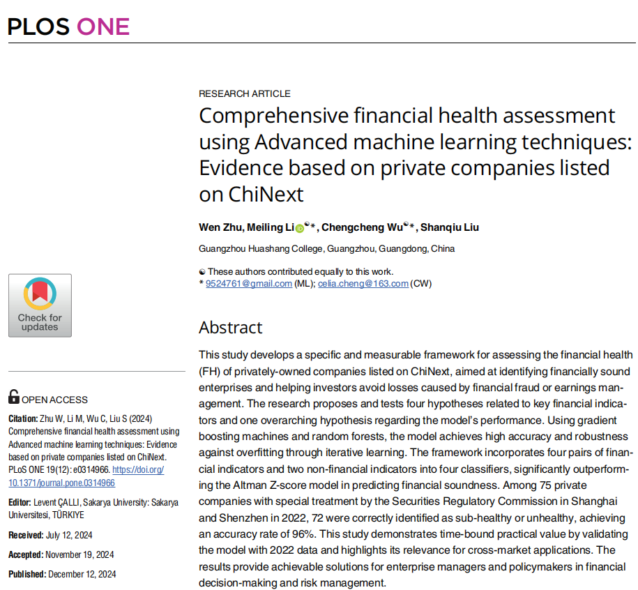 近日,太阳成tyc9728集团朱文教授团队撰写的论文“Comprehensive financial health assessment using Advanced machine learning techniques: Evidence based on private companies listed on ChiNext”在国际期刊《PLOS ONE》成功发表。该期刊为SCIE检索期刊,最新影响因子为2.9,位于JCR Q1分区和中科院三区。太阳成tyc9728集团朱文教授为该论文的第一作者,李美玲及伍程程老师为通讯作者,刘善球教授为共同作者。同时,该论文也为2024年度tyc太阳成9728集团重点科研项目“AI赋能的上市公司财务健康理论与实践探索”(2024HSZD02)再添新成果。