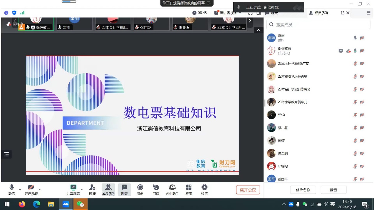 2024年下半年,我校将有12支队伍参加税收风控大赛(广东省分区赛),2支队伍参加智慧税务大赛(广东省赛),两项赛事的省赛环节均将在10月举行。衡信公司是税收教育领域知名的服务提供商,也是往届税收风控大赛、智慧税务大赛、个税精英师挑战赛等税收学专业学科竞赛的技术支持单位。希望此次培训能为学生打造优良的备赛基础,提高学生的竞赛技能与素养。