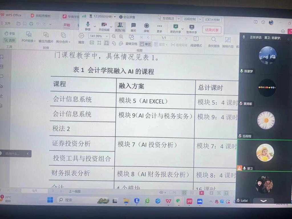 各位课程组教师积极发言,表达了对本次AI嵌入课程实践的热烈期待和支持。他们纷纷就范老师的初步构想提出了宝贵的完善性建议,共同探讨如何更好地将AI模块融入会计系课程中,为学生提供更加丰富、多元的学习体验。