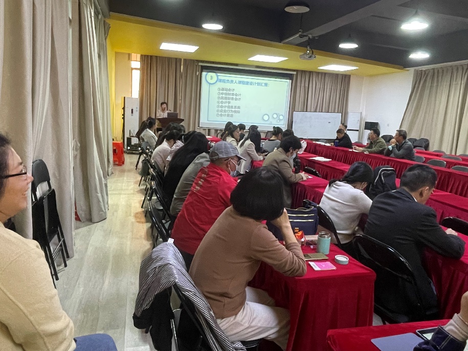 接着,会议进行第三项议程,由会计系6门专业课程(基础会计、中级财务会计学、高级财务会计学、会计信息系统、企业行为模拟、会计英语)的课程负责人代表课程团队作了简要的课程建设计划汇报。课程汇报主要围绕以下四方面展开:课程属性及学情分析、授课内容及方式、课程考核方式的确定、后续课程组集体备课计划等。