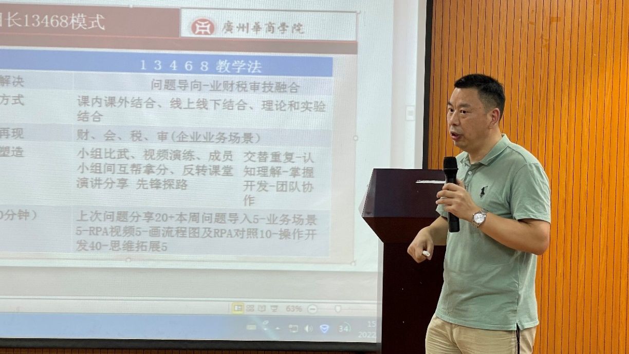 接着,由郑朝亮副教授进行关于《RPA财务机器人》课程的分享。郑老师首先从智能化专业的设置初心开始谈起,深刻的分析了国内现行智能化会计专业的发展趋势,随后展示了RPA机器人的课程发展历程,并结合课堂中学生操作的实际案例为各位老师生动易懂的介绍了《RPA财务机器人》的相关课程内容、课程目标以及教学方式。他提出了一个导向,三个结合,四个场景,六个活动以及八个步骤的教学相长“13468”的新模式,致力于切实解决学生们的学习问题。同时,郑老师还明确指出在这种智能化课程的授课中,老师和学生之间应当是相互学习的关系,教学模式应当是一个以学生为主、老师为辅的启发式学习。