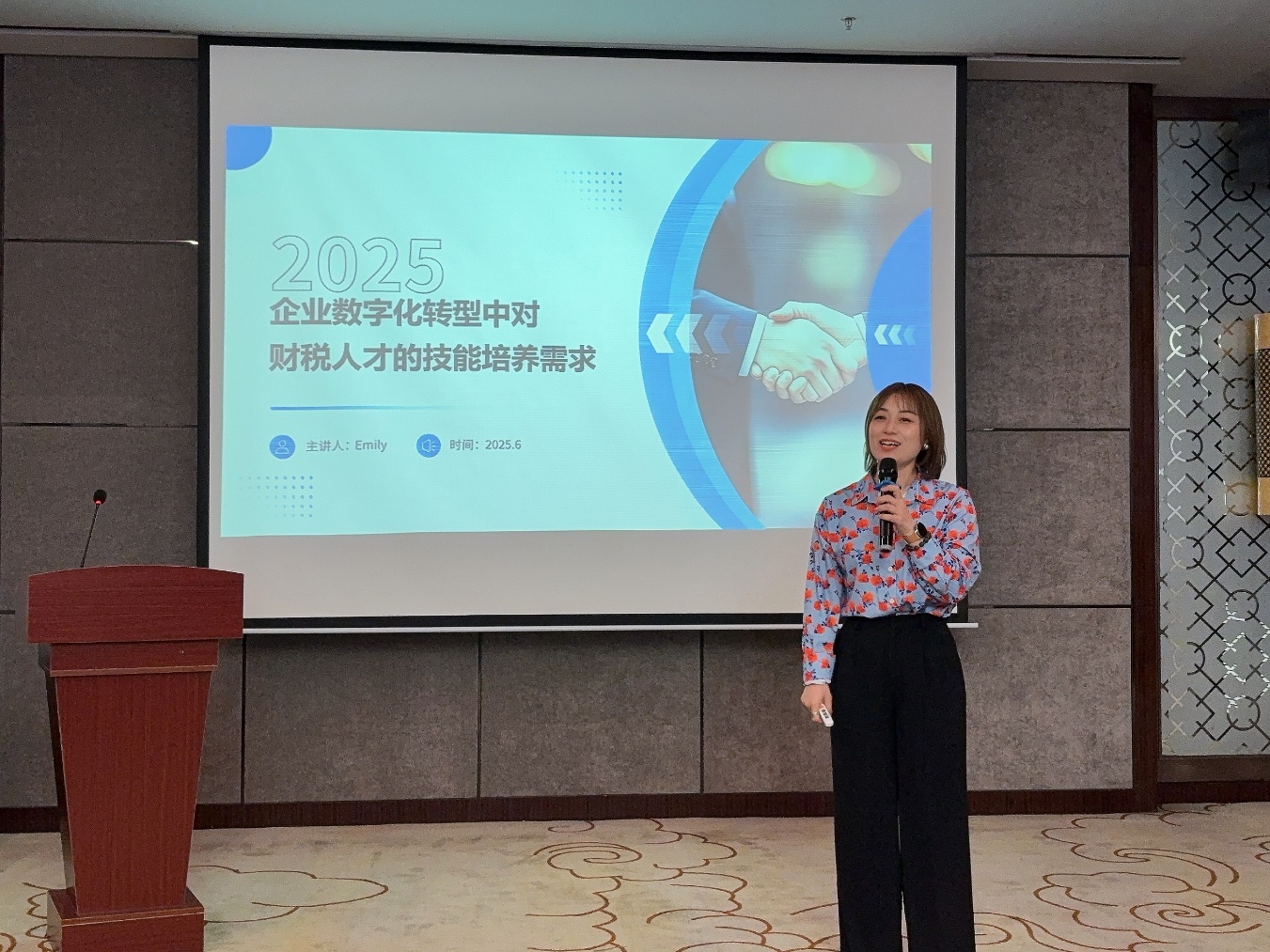 英纳法天窗系统集团有限公司中国区人力资源部张瑞雪总监以“企业数字化转型中对财税人才需求及技能要求”为主题进行分享。她通过对比初级会计和财务总监能力矩阵,分析传统财税人才面临技能单一化、业务融合不足等挑战,强调数字化转型下,财税人才需具备数据分析、业务融合和沟通协作等能力。她指出,虚拟仿真课程、企业实地调研、小组合作汇报等方式有利于培养“懂数据、通业务、善表达”的复合型人才,为太阳成tyc9728集团培养适应企业需求的财税人才提供方向。