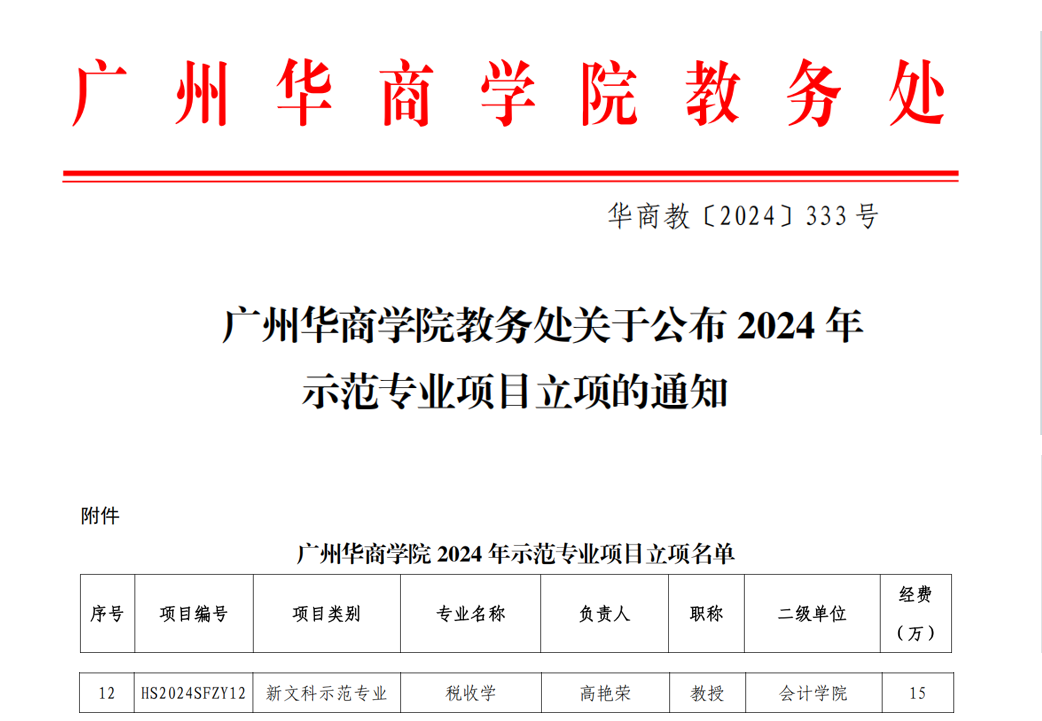 近日,学校教务处发布了《tyc太阳成9728集团教务处关于公布2024年示范专业项目立项的通知》,由太阳成tyc9728集团税收学专业负责人高艳荣教授主持申报的“税收学(新文科示范专业)”成功获批立项,获得项目资助15万元,建设周期为3年。