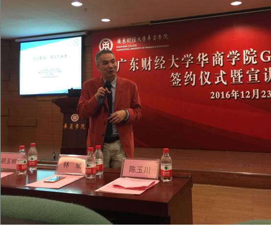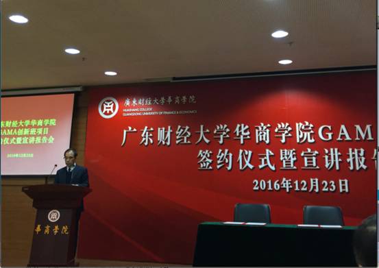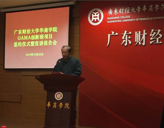 最后,广东省管理会计师协会会长林斌教授对广东财经大学华商学院GAMA 创新班项目进行了专业的介绍。林教授重点讲述了华商GAMA创新班学生的四项专享权利:一是广东省管理会计师协会提供优质师资。由中国会计名家、知名教授、博士生导师亲自授课;二是广东省管理会计师协会提供全过程学术导师与实践导师双导师服务。GAMA创新班学生在大二时配备学术导师,学术导师由中山大学、暨南大学、华南理工大学、华南师范大学与广东外语外贸大学等广东省名校副教授以上专职教师担任,侧重于培养学生的学习能力;GAMA创新班学生在大三时配备实践导师,实践导师由广东省管理会计师协会会员单位资深CFO担任,侧重于指导学生提高实务操作能力;三是为GAMA创新班学生推荐实习与就业单位;四是为优秀GAMA创新班学生提供奖学金。广东省管理会计师协会为GAMA创新班”品学兼优的学子每学年提供2000-5000元的奖学金。
