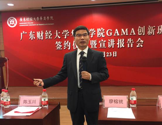 首先,陈玉川院长代表华商学院致辞。陈院长在致辞中讲到,今年我院学科专业建设取得重大成果,会计学被确定为2016年广东省高校特色重点学科、新闻传播学被确定为2016年广东省高校重点培育学科,这对于推动我院学科专业的改革发展,提升我院教学科研水平有极大的促进作用。华商学院GAMA创新班的设立,将搭建起一个集产学研于一体的平台,整合高水平大学、知名企业和社会各方面优势资源于我院,为培养具有创新能力、实践能力和自我发展能力的复合型、应用型、管理型人才起到很好的引领作用。华商学院GAMA创新班的签约,也是对校企合作应用型人才培养模式的积极探索,将对我院学科专业的发展起到积极的推动作用。