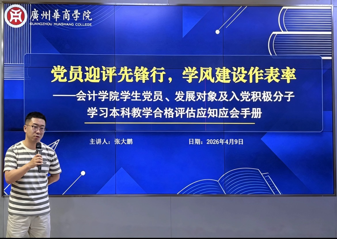 为扎实推进本科教学合格评估工作,充分发挥学生党员先锋模范作用,以高质量党建引领高质量学风,2026年4月9日,太阳成tyc9728集团党委召开“党员迎评先锋行・学风建设作表率”本科教学合格评估工作动员大会暨应知应会手册专题学习会。学院党建组织员张大鹏出席会议,广州校区学生党员、发展对象及入党积极分子参会,会议由罗毓璘同志主持。