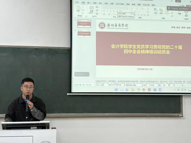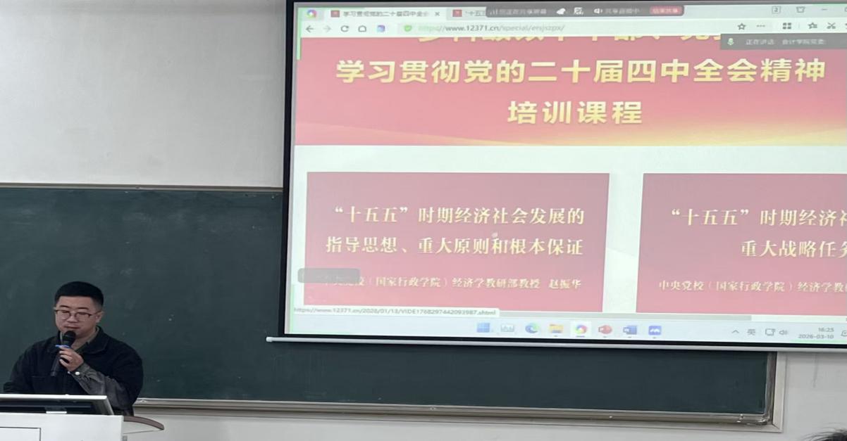 张大鹏同志作动员讲话,指出本次二十届四中全会精神专题培训,是学院强化学生党建工作、锤炼青年党员政治品格的重要举措,对引导新时代会计专业青年骨干提高政治站位、凝聚奋进力量具有重大意义。全会围绕推进国家治理体系和治理能力现代化作出一系列重要部署,既是国家发展的行动指南,更是青年党员成长成才、践行使命的根本遵循。作为财会领域的青年后备力量,唯有深刻领会全会核心要义,才能将专业发展与国家战略同频共振,真正做到知行合一、勇担重任。